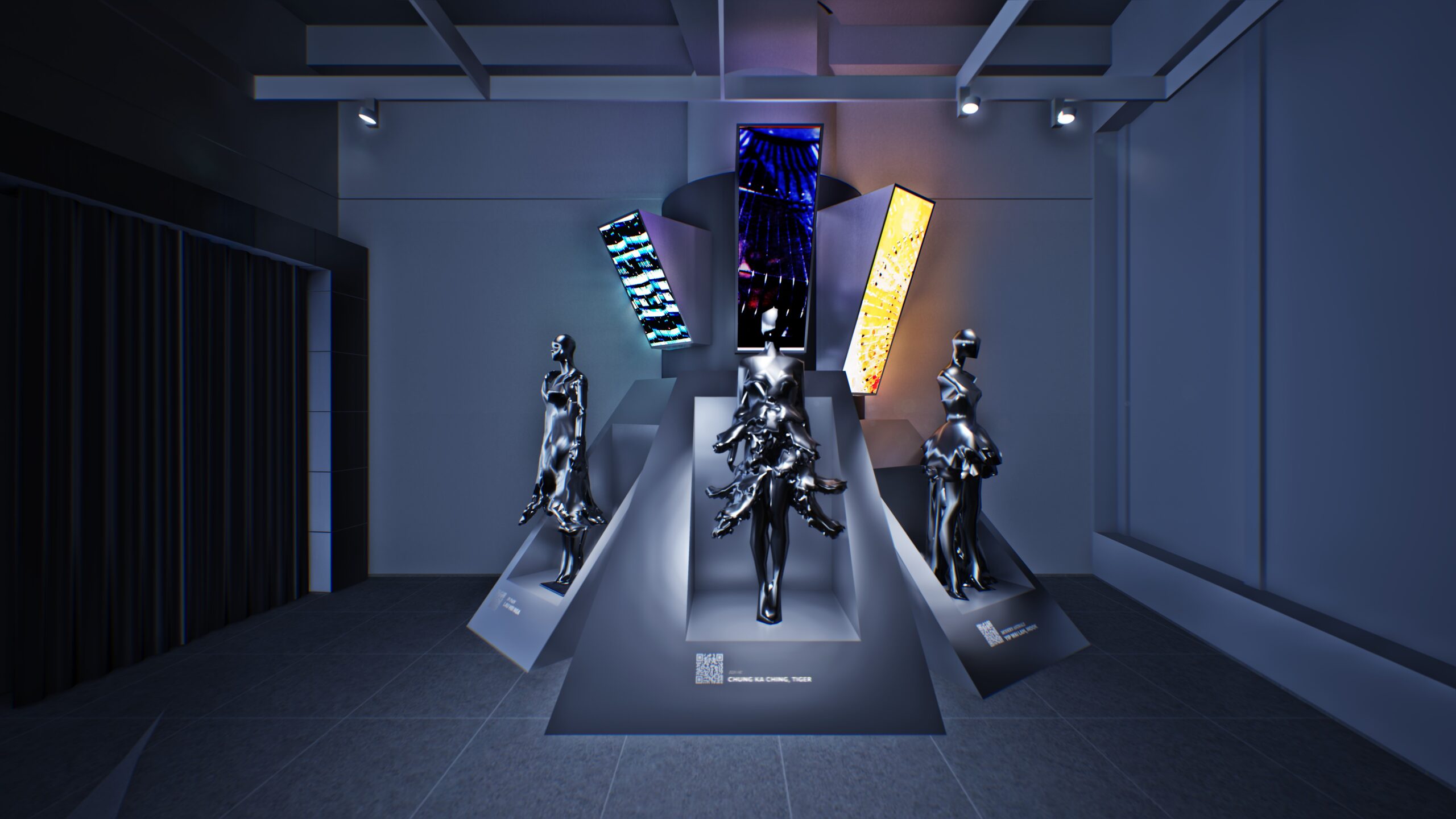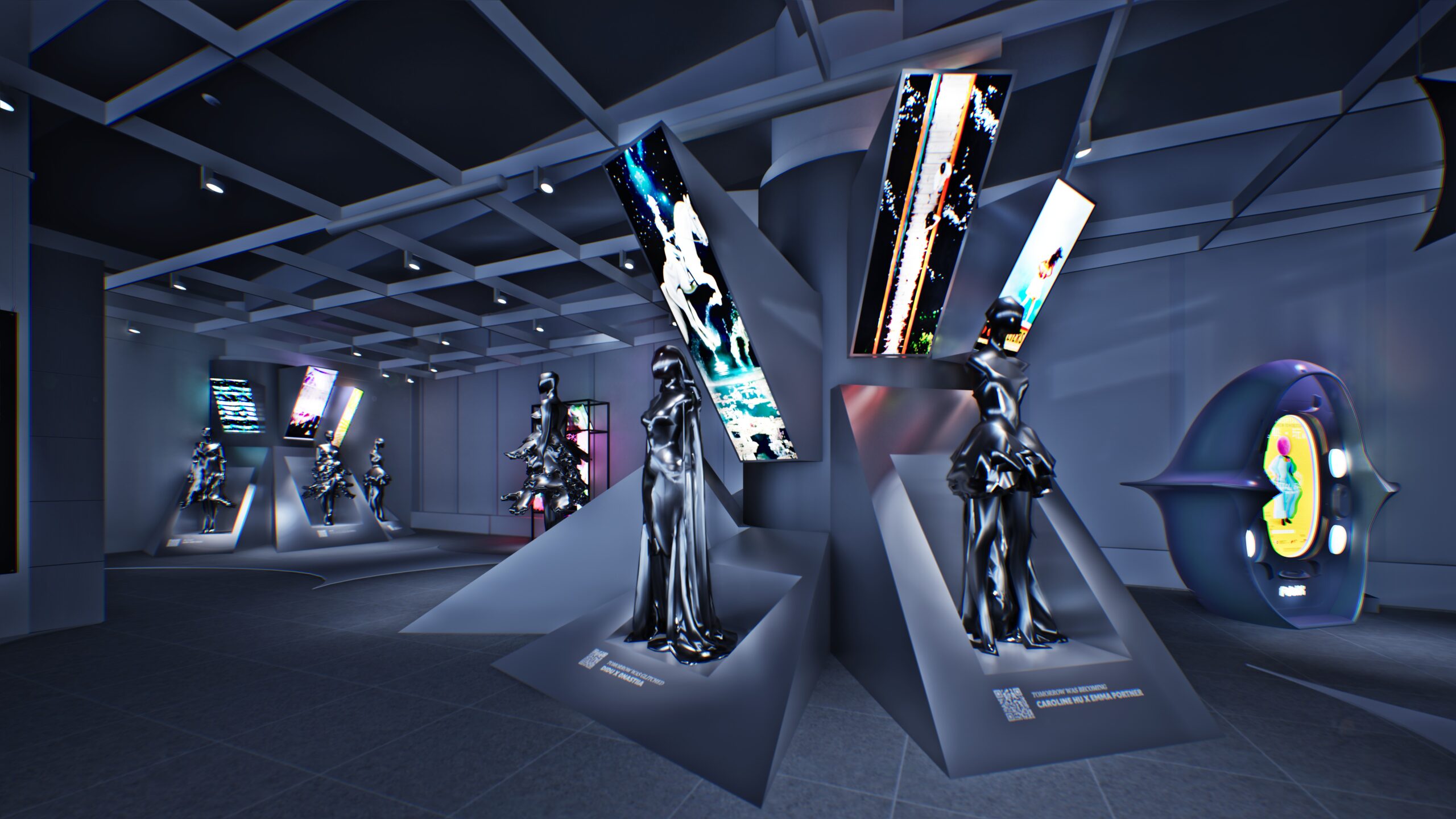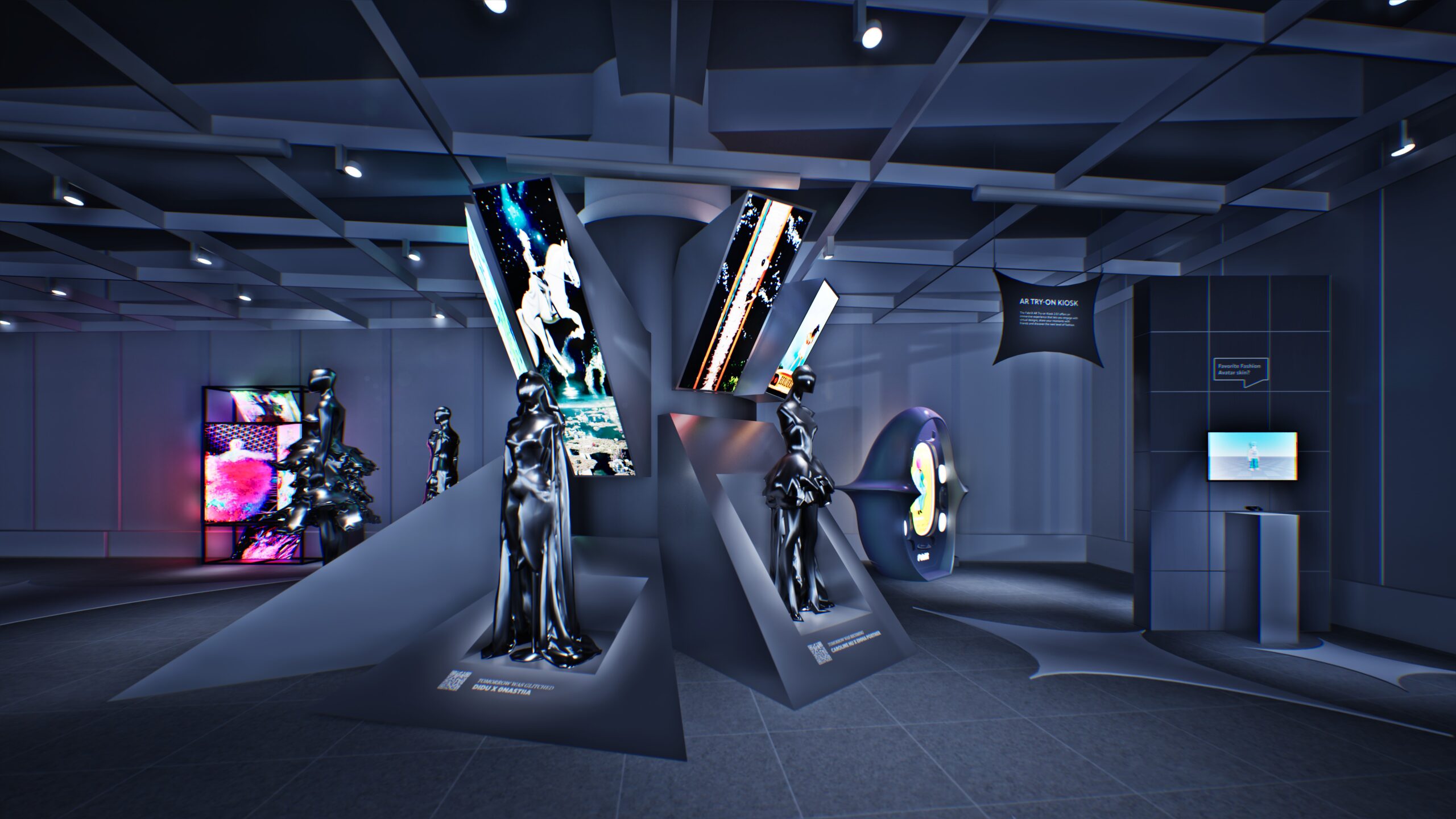 The exhibition culminates in a celebratory afterparty where every visitor unlocks their own blind-box–style avatar through a rapid 3D scan. Instantly styled in one of six futuristic looks, each guest becomes the star of a kinetic LED showcase.