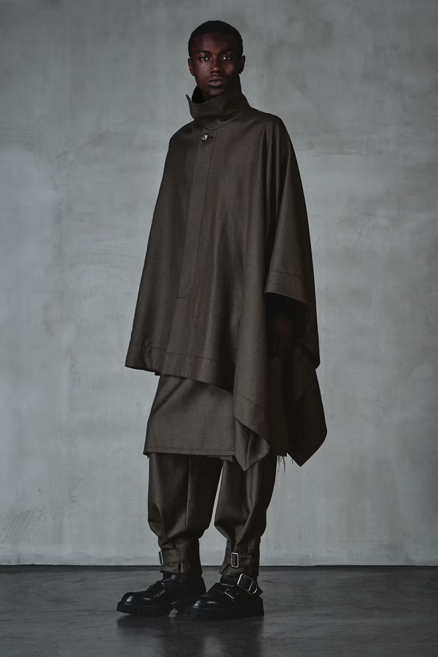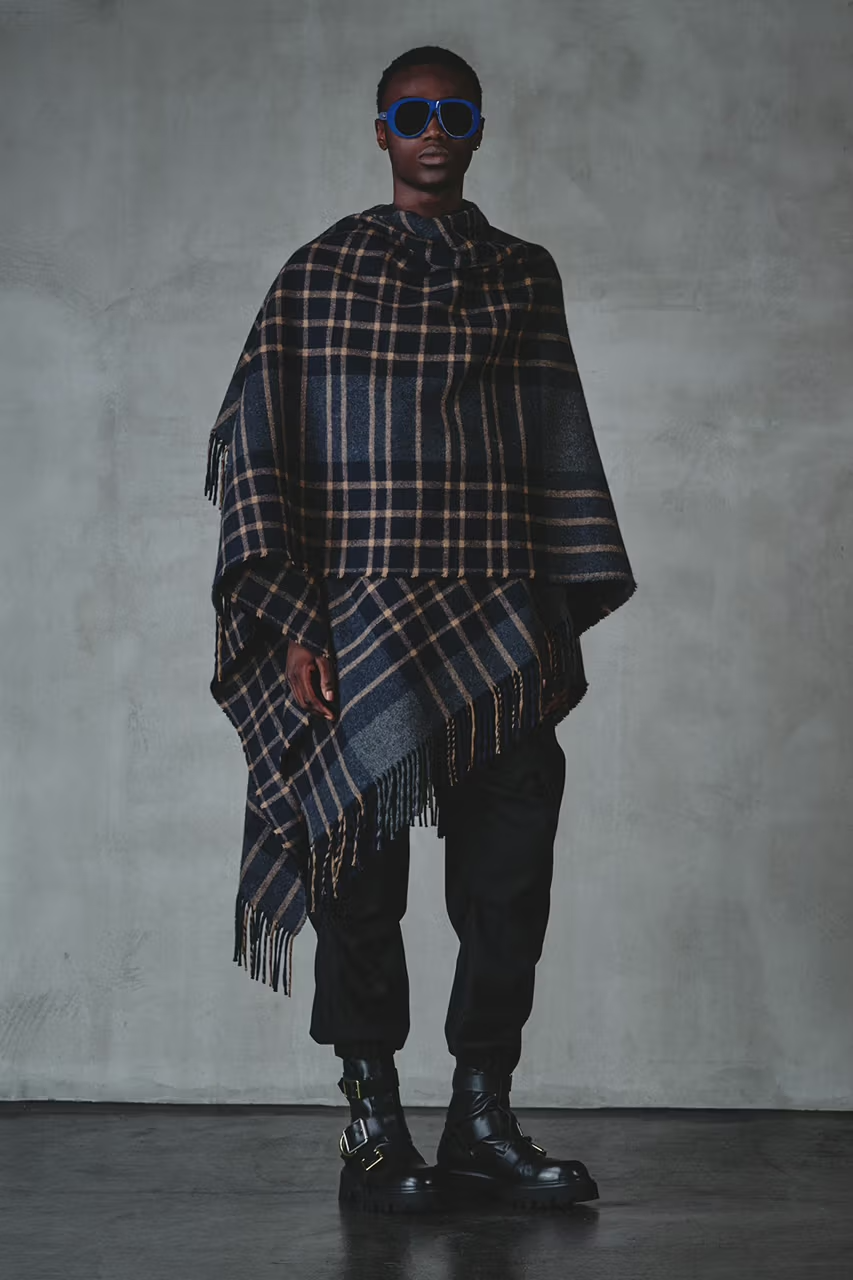 The collection explores subversion through structure. Cropped overshirts, frayed capes, and asymmetrically cut shirting present a raw yet refined aesthetic. Tartan remains a house signature, yet this time, it appears bleached, illustrated, and artfully abstracted—defying tradition while honouring heritage.